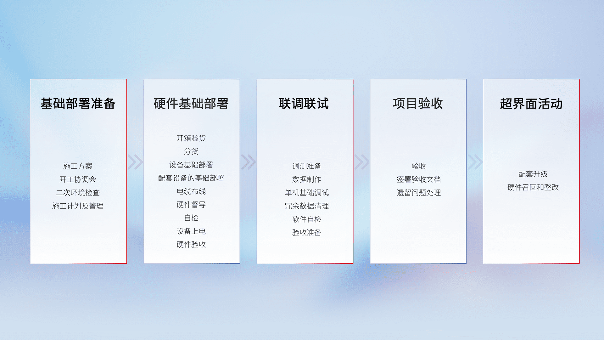 从基础部署准备、、硬件基础部署、、联调联试、、项目验收、、越界面活动的全过程可追溯,,,,保证施工质量和进度。。。